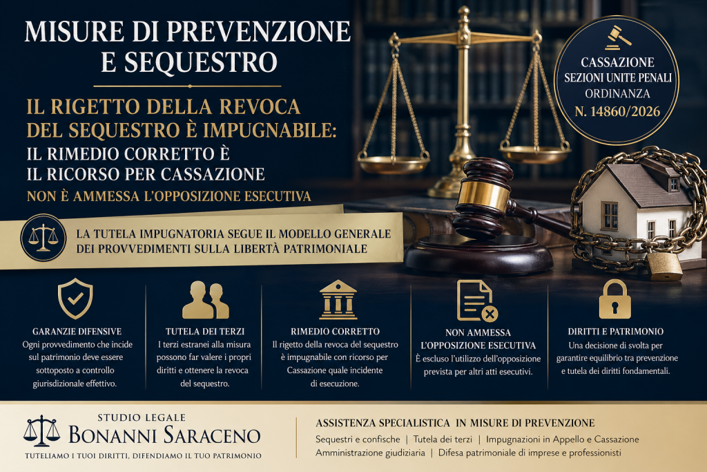 L’ordinanza n. 14860/2026 delle Sezioni Unite rappresenta una pronuncia di svolta nel diritto delle misure di prevenzione. Il rigetto della richiesta di revoca del sequestro non è più relegato in un’area di incertezza processuale, ma trova un preciso strumento di controllo nel ricorso per Cassazione, con esclusione dell’opposizione esecutiva.