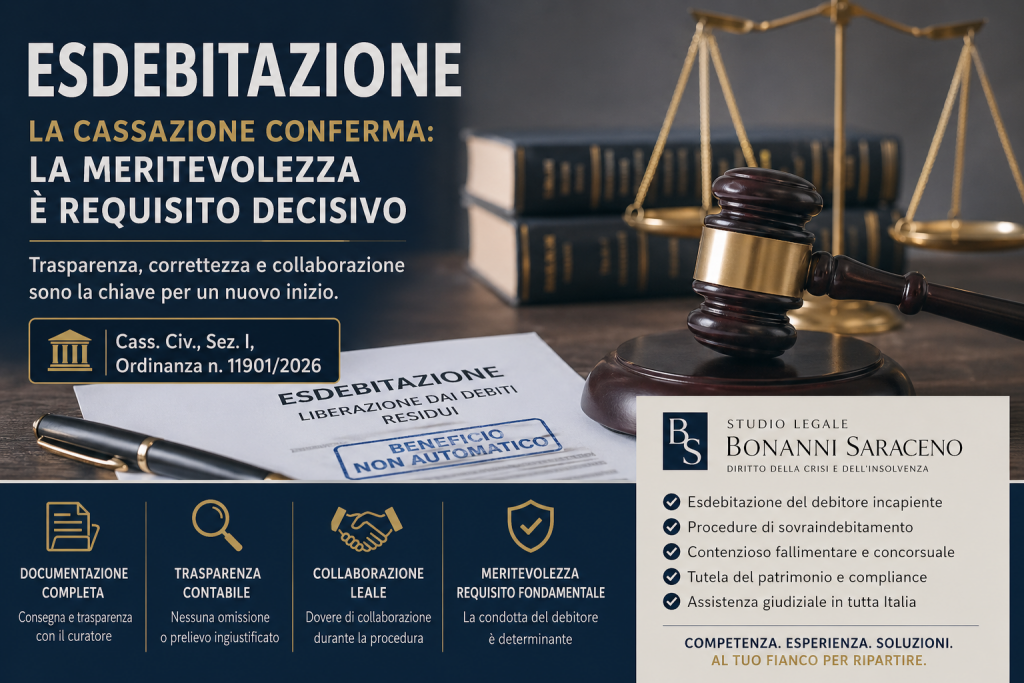 Con l’Ordinanza n. 11901 del 30 aprile 2026, la Prima Sezione Civile della Corte di Cassazione ha ribadito un principio di assoluta centralità sistematica: il beneficio dell’esdebitazione non costituisce un diritto automatico, ma richiede la verifica rigorosa della meritevolezza del debitore.