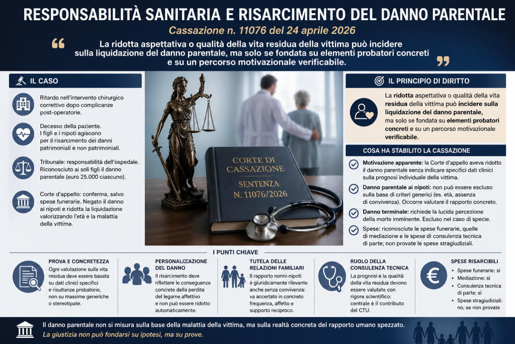 Con l’ordinanza n. 11076 del 24 aprile 2026, la Corte di Cassazione affronta alcuni nodi centrali della responsabilità sanitaria e della liquidazione del danno non patrimoniale conseguente al decesso del paziente: il danno terminale da lucida agonia, il danno da perdita del rapporto parentale in favore di figli e nipoti, la rilevanza delle condizioni patologiche pregresse della vittima primaria nella quantificazione del risarcimento e il regime delle spese stragiudiziali e tecnico-peritali. Il principio di maggiore rilievo riguarda l’affermazione secondo cui la ridotta aspettativa o qualità della vita residua della vittima può incidere sulla liquidazione del danno parentale, ma solo se tale valutazione sia fondata su concreti elementi probatori e su un percorso motivazionale logicamente verificabile. La decisione si colloca nel solco della più recente giurisprudenza di legittimità che impone personalizzazione, rigore probatorio e divieto di automatismi liquidatori.